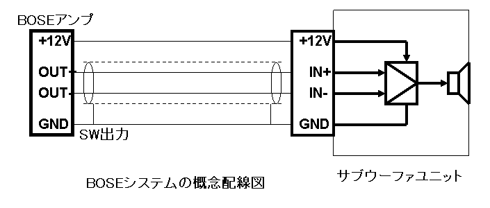 BOSEシステムのサブウーファに関係する部分は上の図のようになっています。BOSEアンプから出たサブウーファ用のラインレベルのバランス出力と電源はサブウーファに入って内蔵アンプで増幅されます。内蔵アンプの出力などは公表されていませんが、数十Wと想像されます。このアンプに電力を供給するラインは長い距離を走っているのに細い線なので悪影響が出ていないか心配です。