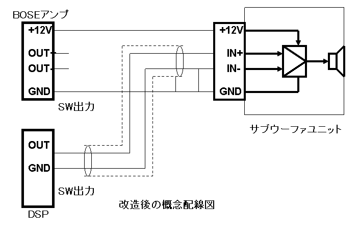 改造の概念は下の図の通りです。サブウーファの入力を切って、そこにDSPのサブウーファ出力を接続します。サブウーファの入力はバランスですがDSPの出力はアンバランスなのでサブウーファの入力部分でIN-をグランドに落としています。