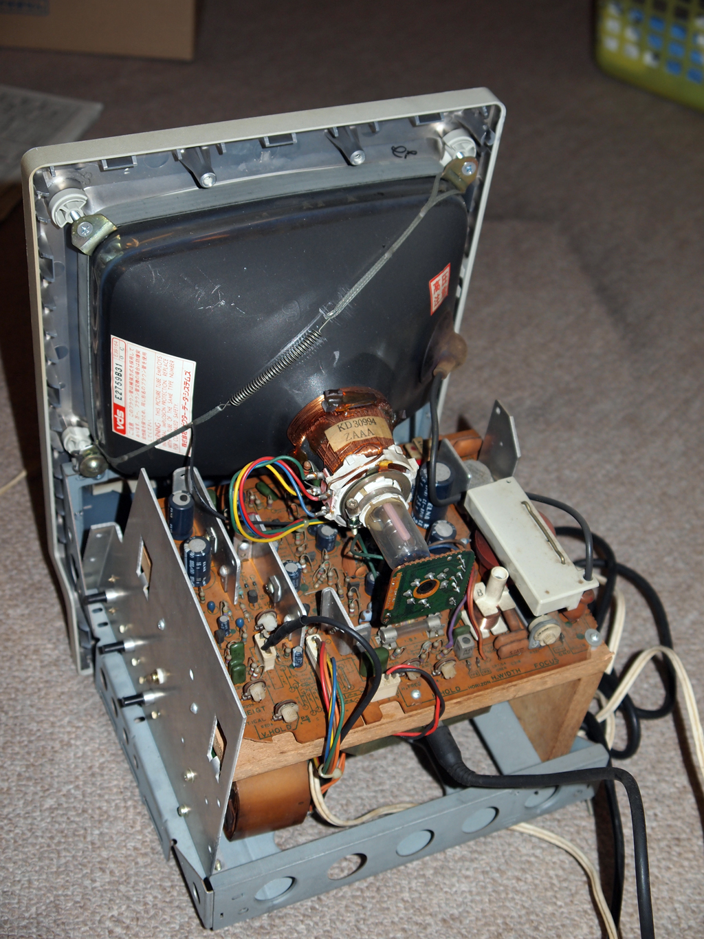 内部には名器の誉れ高いJVC のグリーンの9インチCRT を組み込んであります。元のCRT 固定用のネジ穴がうまく利用でき、CRT の前面の曲率もほとんど同じだったのできれいに組み込めました。昔はApple-][ につないで使用していました。この中身はすべて取り払いスペースを作りました。