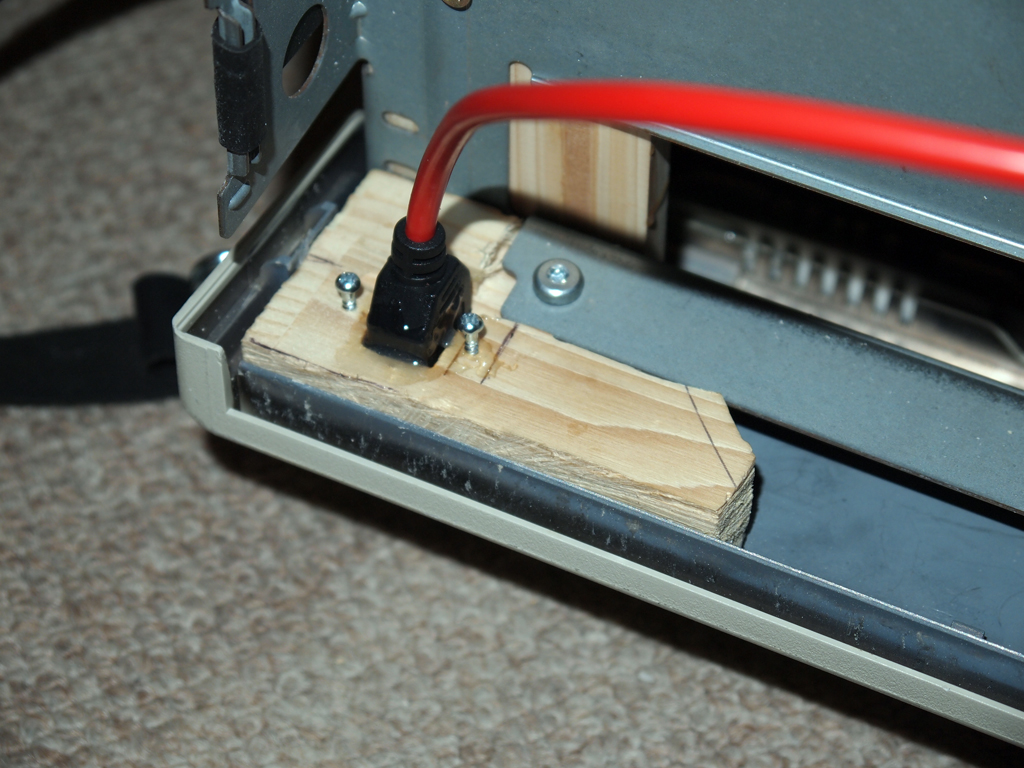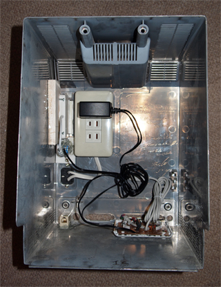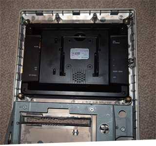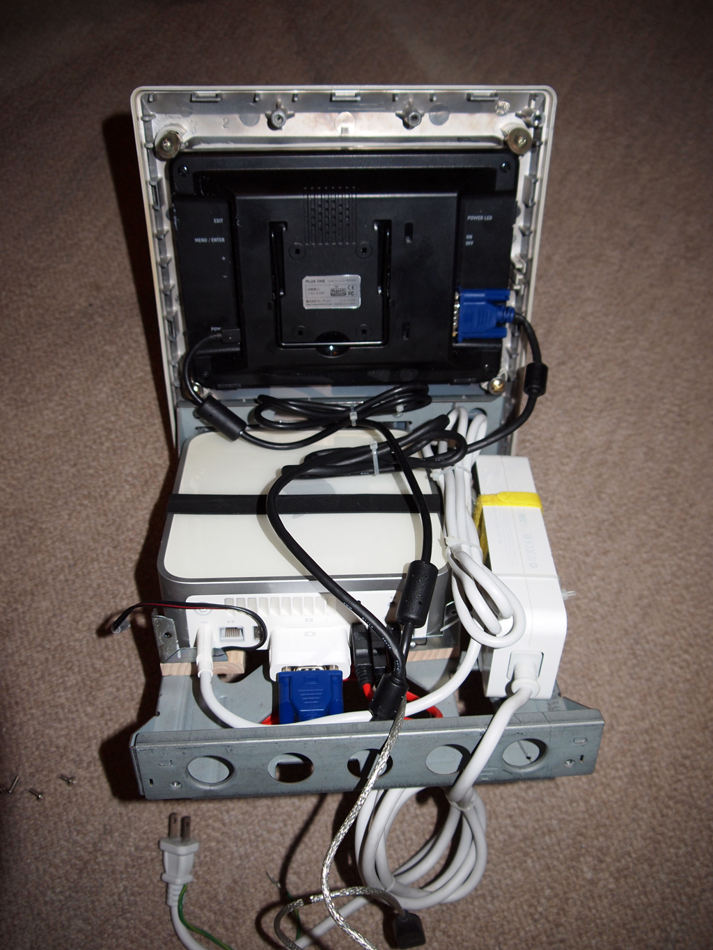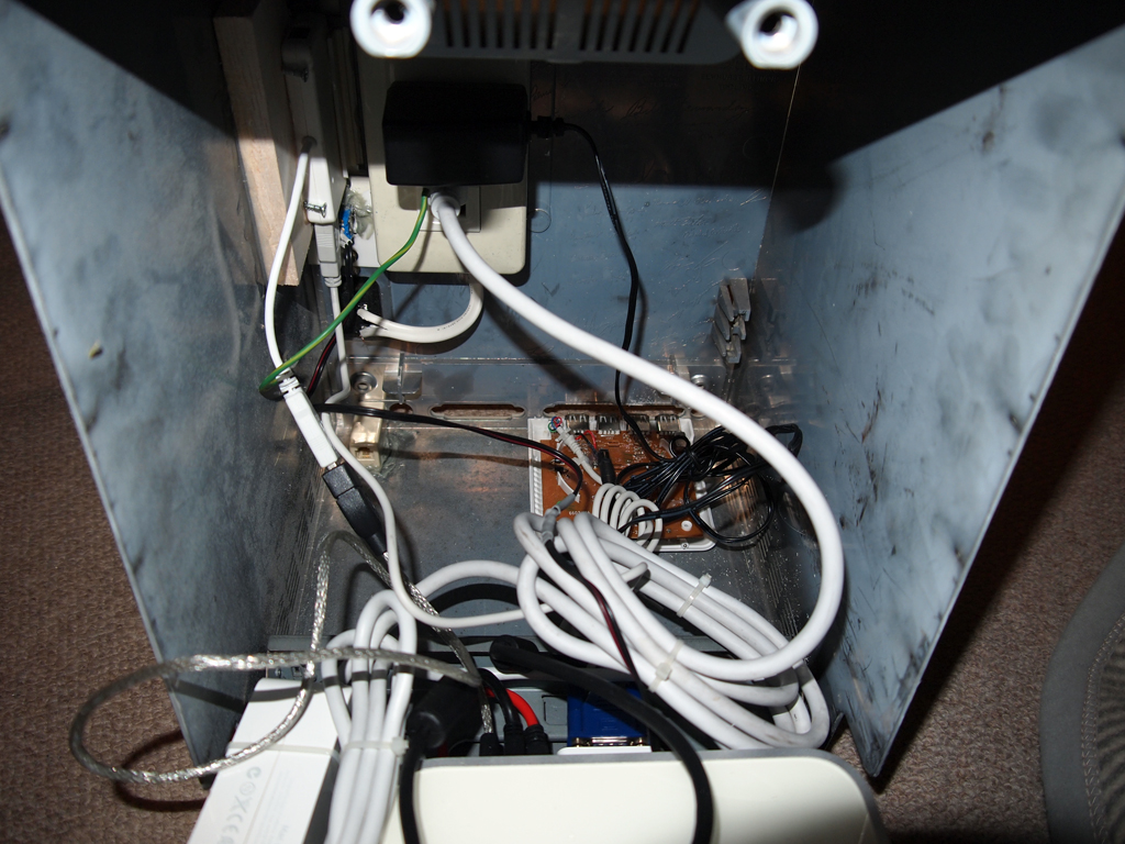 これが筐体後部の内部です。AC コンセントがあってぎょっとするような光景ですが、Mac mini のオリジナルのAC アダプタのケーブルを切断したくなかったのでCRT が無くなってがらあきになった部分に設置しました。右下にあるUSB ポート用のAC アダプタもここに取り付けました。