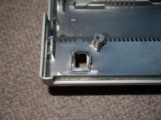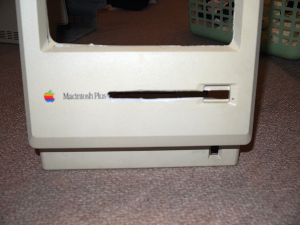 スロットの加工 フロッピー挿入口を拡げました。ルータのトルクが強すぎて暴れてしまいギザギザになってしまいました。ヤスリの手作業にした方が良かったかもしれません。ギリギリでロゴにかからずに済みました。