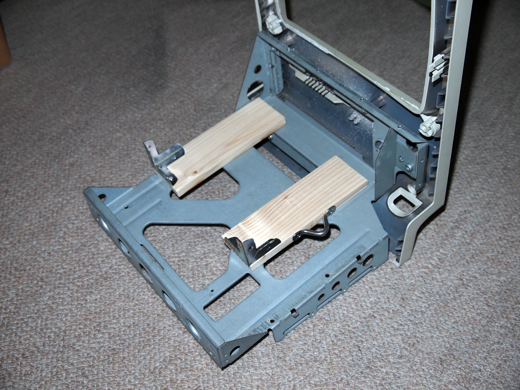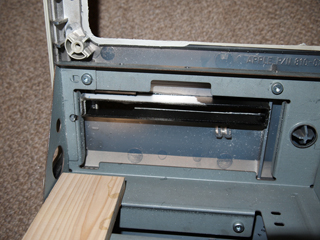 位置を確かめてみるとMac Mini の下に9mm の板を置くとCD/DVD スロットがフロッピー挿入口に来ることがわかったので下駄を履かせました。もともと開いていたネジ穴を利用して下から木ねじで止めてあります。板の後方の金具はMac Mini を固定するためのもので、前方はシャーシにぶつかるのでこれで位置決めできます。フロントパネルに接するようにできれば良いのですが鉄のシャーシに引っかかるので少し後方に設置しました。