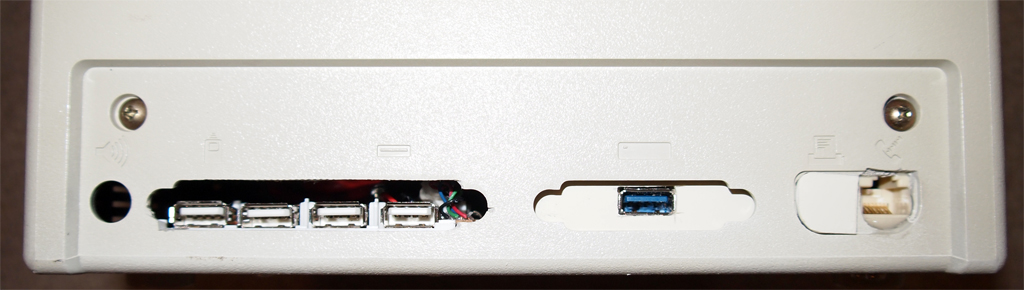 右上にはバスパワーのUSBが3ポート、左下にはセルフパワーのUSBが4ポートあります。USB ポートを数多く使う予定はないのですが使用していない穴がたくさん残るのがいやだったので使えそうなものを探したらUSB ハブがぴったりのサイズでした。右上のUSB ポートの周囲はプラスチック板でふさいであります。右下はLAN コネクタ、その上はAC のインレットです。下部中央のUSB 1ポートはMac mini 本体から直接引き出したポートで、ハブ経由では動作しない周辺器などを接続します。