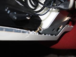 シャーシを取り付けると板を押さえるので十分な強度が得られます。シャーシに当たる部分はルータで2mm ほど掘り下げてあります。USB の中継ケーブルをエポキシで固定しました。これでも相当な強度が得られていますが、エポキシはショックに弱いのでこの上からエポキシパテで固める予定です。コネクタの両側の木ねじはエポキシパテの中に埋め込んでアンカーにします。