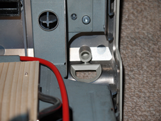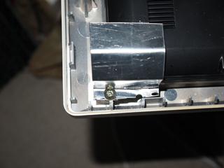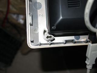 筐体で加工しなければならない二カ所です。まずCRT 用に曲面になっている取り付け面をLCD 用に平らにしなければなりません。このカーブの部分をミニルータで切り落として直線にします。