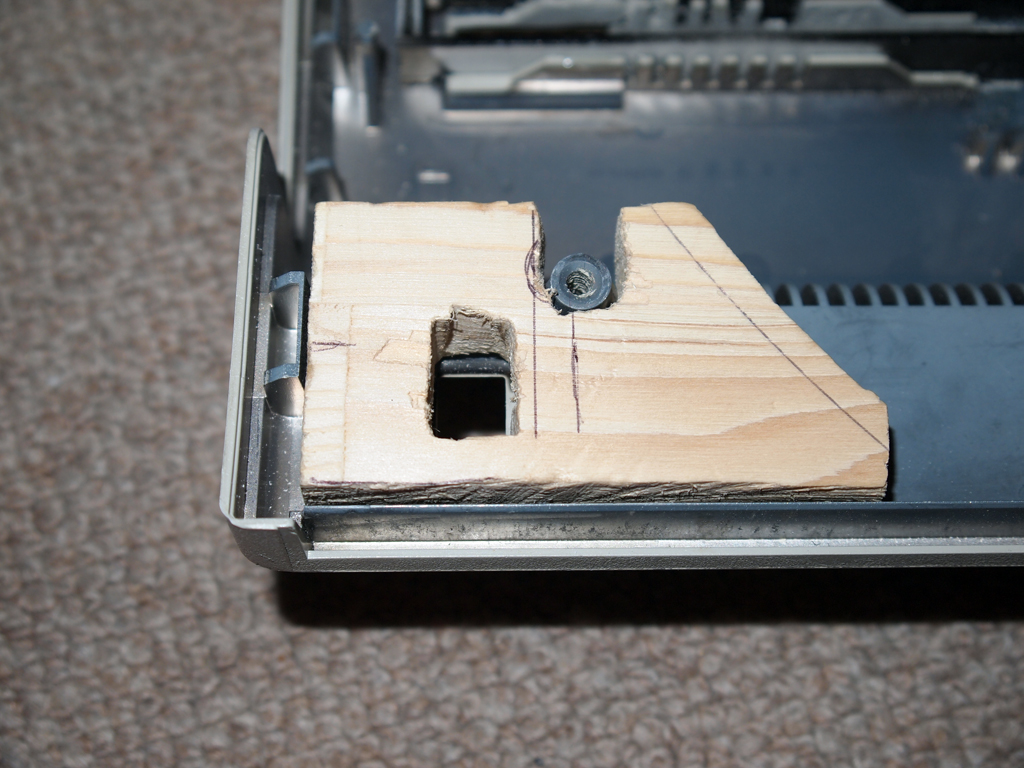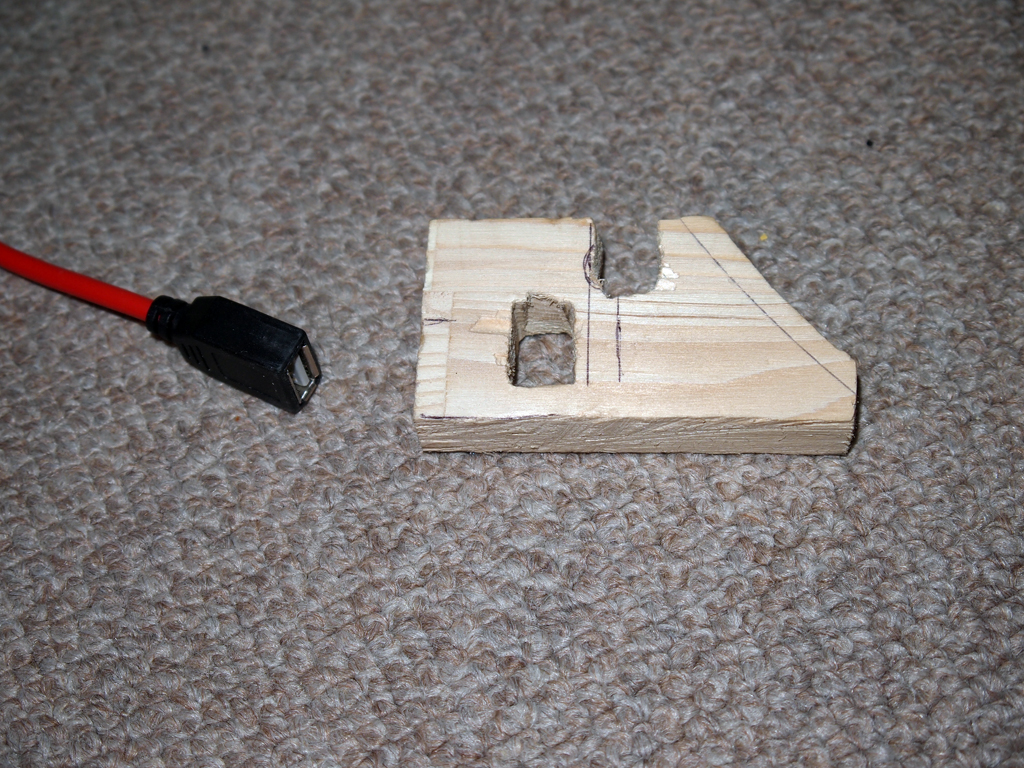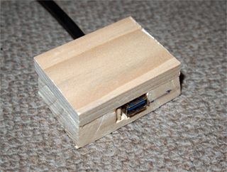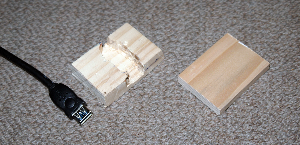手持ちの500GB のUSB HDD を内部に設置していましたが、こんなマシンに1TB はオーバースペックですので取り外し、空いたUSB ポートをダイレクトに外部に引き出すことにしました。基台となる木のブロックをUSB延長ケーブルのコネクタが入るようにルータで彫り込みました。右の木片は蓋です。