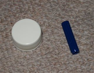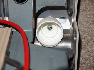 ペットボトルのキャップがちょうど良いサイズで周囲のローレットもそれらしく見えるので塗装して使用しました、キャップはポリエチレン製なので塗料ののりが悪いのですが実際に操作するものではないのでそれほどの強度は必要ないでしょう。右はキャップを木ねじで止めるために上の写真の丸穴に埋め込むプラスチックプラグです。本来はコンクリート壁などに使用するものですが、丸穴の深さに合わせてカットして使用しました。