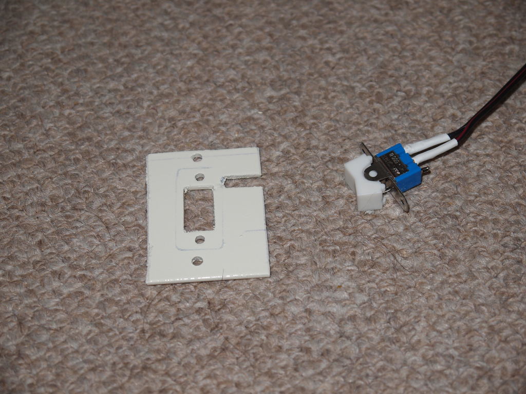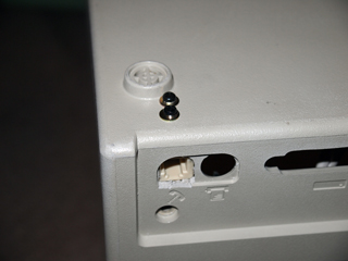 パワースイッチ 電源スイッチです。Mac mini の電源はモメンタリースイッチで押したときだけ導通して離せば切れるタイプです。筐体に合うオリジナルのスイッチのサイズで探したのですが一回り小さなものしかありませんでした。これを取り付けるためのプラスチックパネルを作成しました。