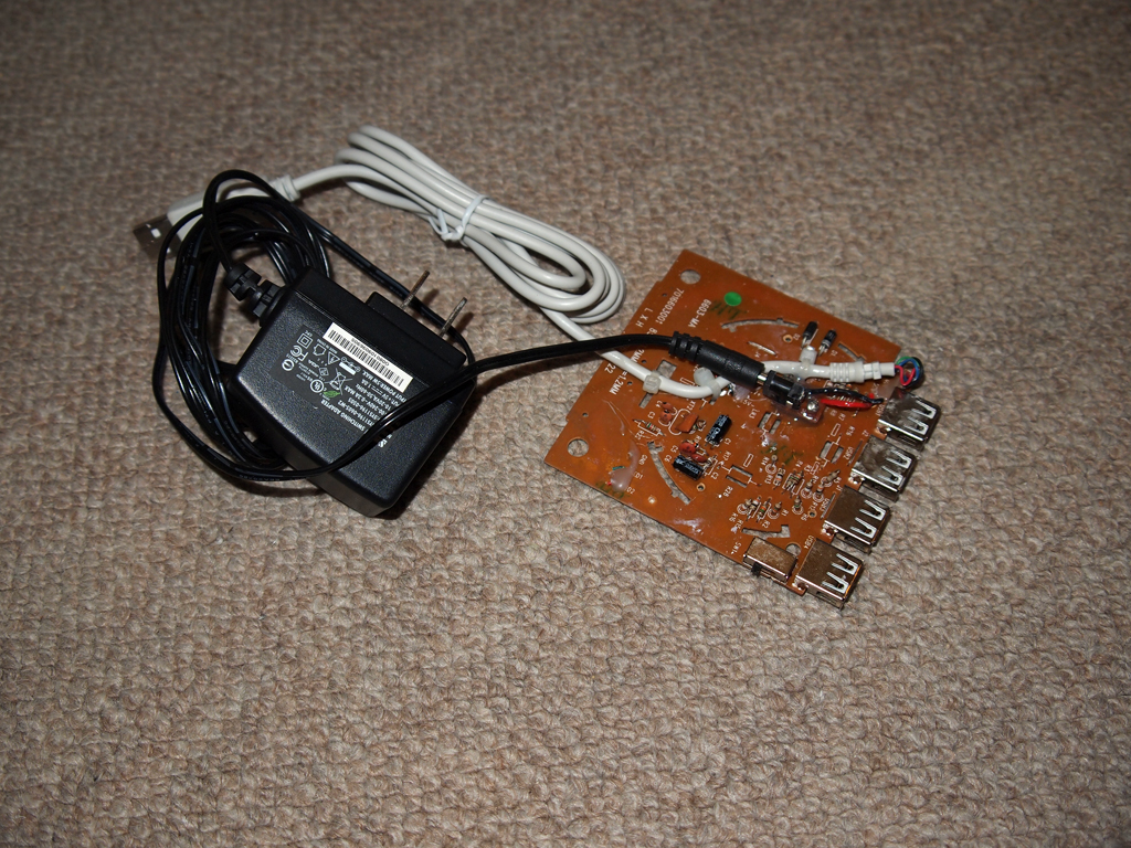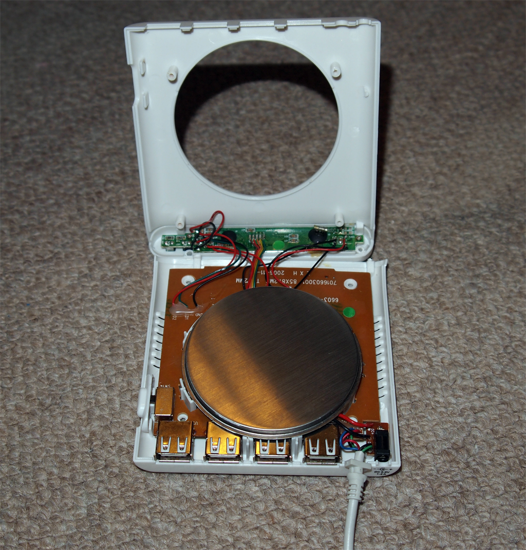 筐体を開けた状態です。USB ハブ以外の不要なものは全て取り除きうっかりして作動しないようにしました。