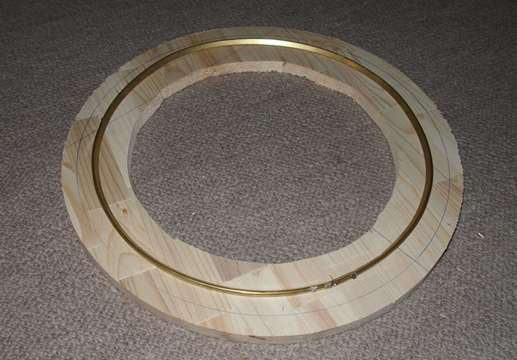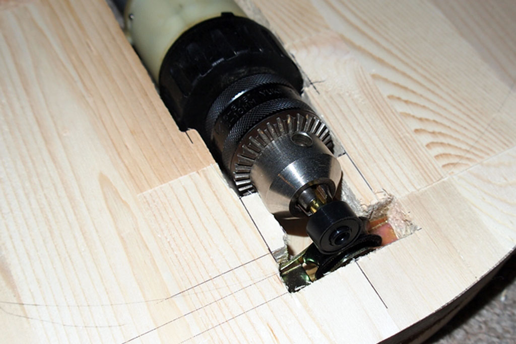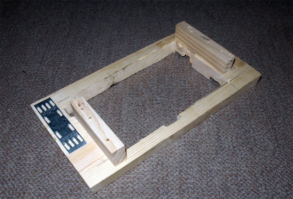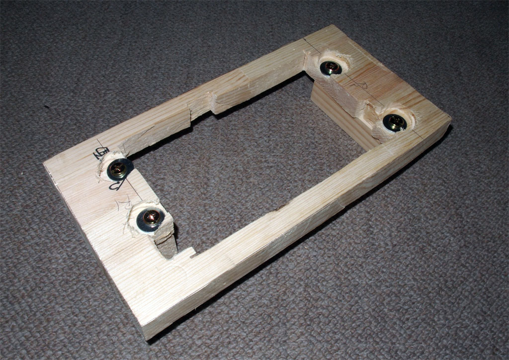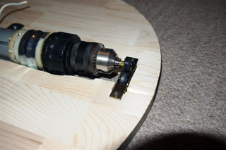 カットしたモーター台を4枚重ねてボンドで接着しました。木ネジで固定するつもりでしたが、パイン材がもろいためボンドのみとしました。はがれる方向には力が加わらないので問題は起きないと思います。また基台には木ネジ4本とボンドで固定するため下穴を開けました。写真は下穴を開ける前の状態です。 |