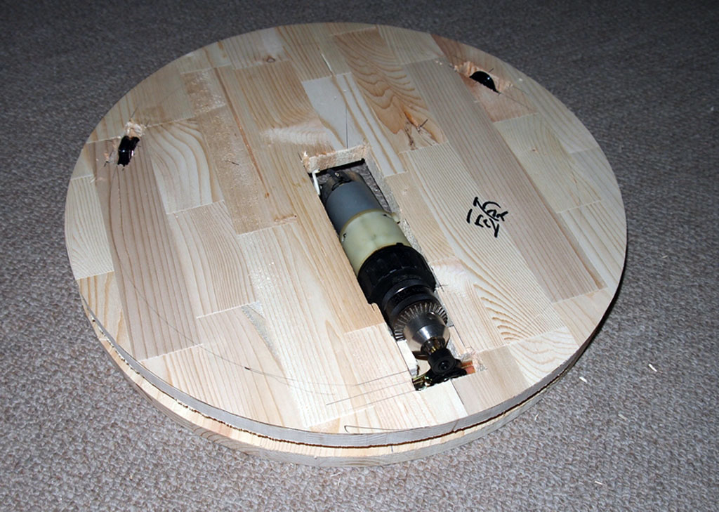 足の裏の板にモーター部分を取り付けるための下駄をはかせました。下駄はモーター部分には接着しますが、足の裏はメインテナンスを含めた作業性のためにボルトで固定してとりはずしできるようにします。下駄にはねじ込み型のナットを埋め込んであります。ここは重量で押し付けられる部分なのでズレを押さえるだけでよく強度は必要ありません。