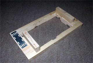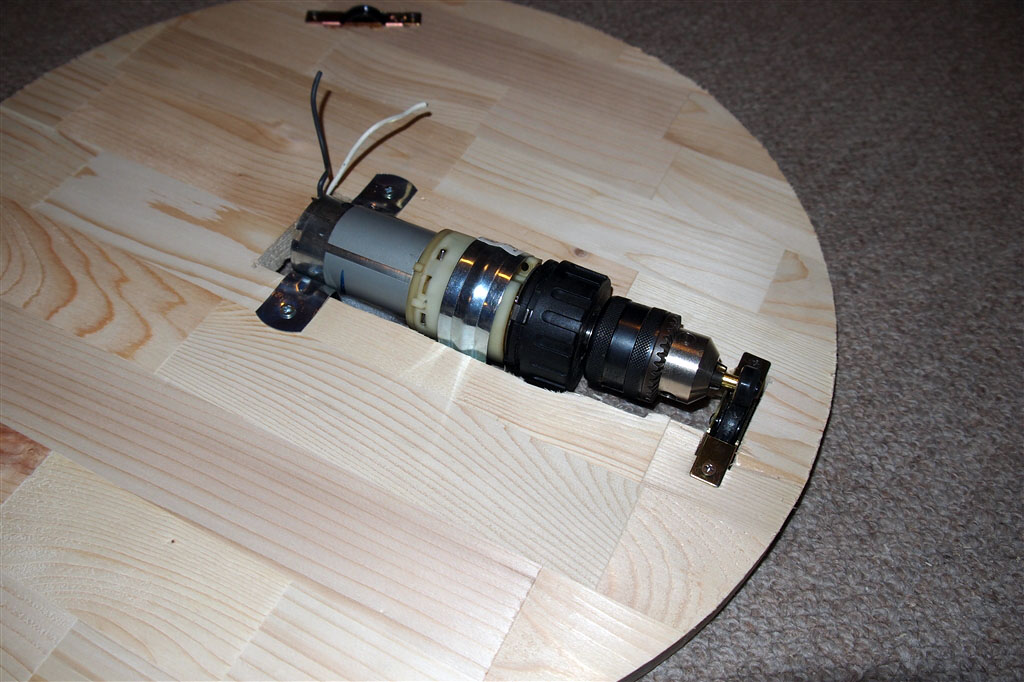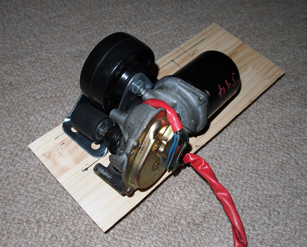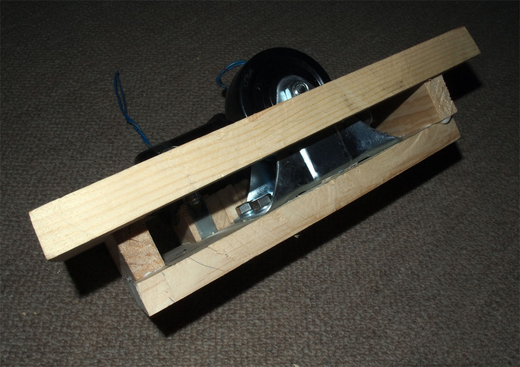 基台にモーター以外の主要パーツを取り付けました。左端にある木ねじはモーターの位置を決めるための支えです。モーターの受け台には木ネジ4本とボンドを使用するつもりでしたが手頃な木ネジが工具箱になかったので釘とボンドで固定しました。釘を引き抜く方向には力が加わらないので横方向のずれ防止には十分でしょう。モーターに接する部分には滑り止めの薄いゴム板を貼ってあります。右端のホースベルトでモーター本体を固定します。このバンドが通る部分はトリマーで溝を掘ってあり面一になるようにしてあります。 |