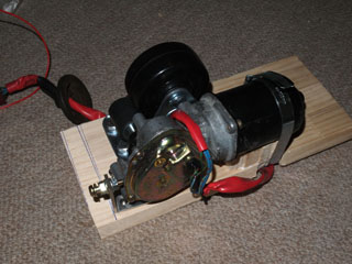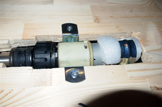 しばらく試しているとモーターがホースバンドを支点にして若干外に逃げる傾向が出ました。圧が減ってスリップするほどではないのですが、経時変化で大きくなるのが心配なのでL金具か外板で外側から押さえるようにします。 |