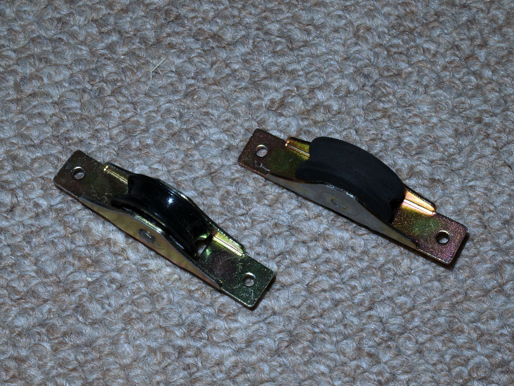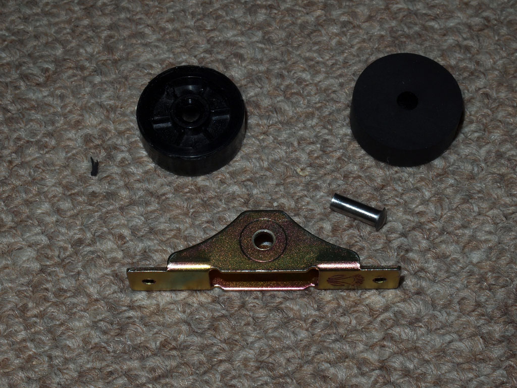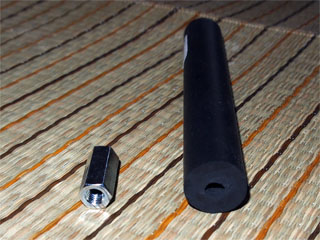 左は六角の長ナット、右は中心に穴の開いているゴムの丸棒です。どちらもホームセンターで入手した物で、これでローラーを作成します。 |