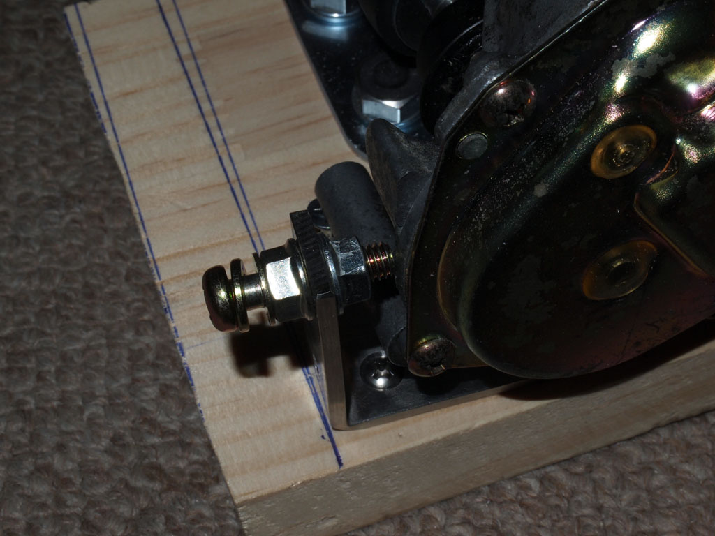 しかしモーターを回してみるとゴムローラーが若干偏芯しており、位置によってスリップしスムーズに回転しません。手で押し込んだくらいでは十分な圧がかからないので位置決め用のボルトを追加しました。ローラー軸が緩まないよう前進時にねじが締まる方向にするため前進時は右方向に動きます。またモーターの特性から左右対称ではなく両方とも同じものを作ります。