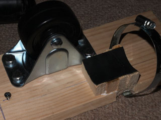 モーターを取り付けて完成したアッセンブリーです。基台は右端をカットすることでなんとか足に収まりそうです。ホースバンド一本だけで十分か不安もありましたがゴムローラーと車輪の位置の関係でホースバンドを支点に動いたとしても車輪に押し付ける方向か基台に押し付ける方向なのでがたつくことはありませんでした。
