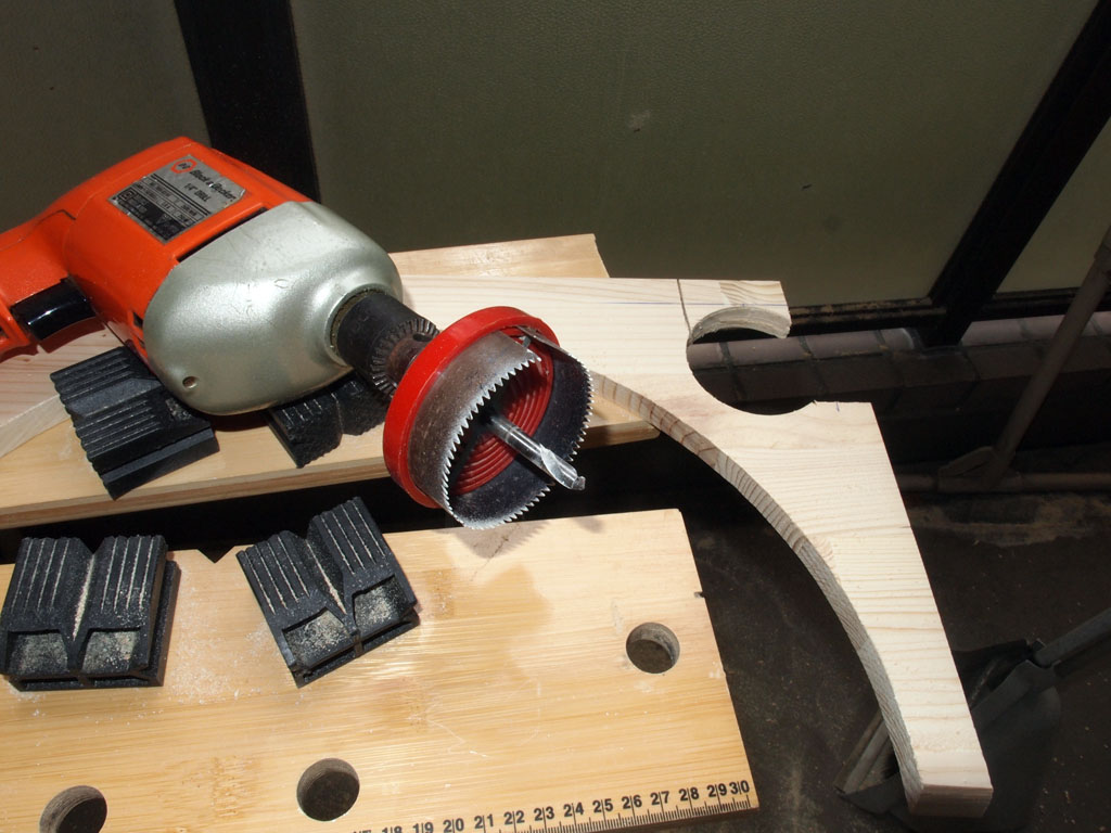 モーターを固定する台を製作しました。モーター本体が58mmφなので60mmφのホールソーで穴を開けました。モーターは基台から15mm浮かせるのでそのように穴を開けカットしたものをモーターごとに4枚作成しました。