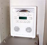 コーナーに置いて低域を強めるとタイルのエコーも加わってずっと良い音になりました。低い音量でBGMを流すには十分な音質です。こんなことをしても大丈夫でしたが水がスピーカグリルに溜まってひどい音になります。中には入らないので故障はしませんが、よゐこはまねしなひやうに。 CDとバッテリーの入れ替えの際は背面の蓋を開けます。